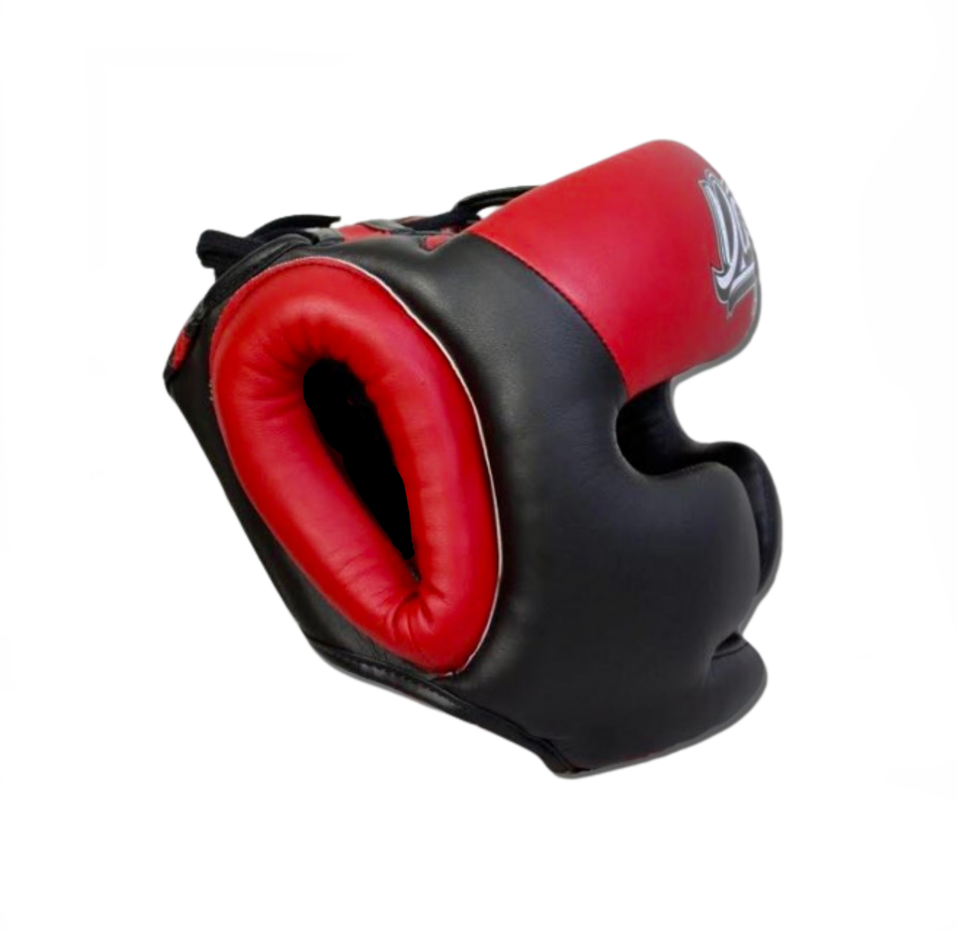 Head Guard Profesional is made with a multi-layered foam system with extra padding around the ears and forehead. Specially designed cheek protectors ensure maximum visibility even from shots below the eye line. Lace-up on top and back with Velcro closure for secure fit. Made in Thailand from Semi leather.